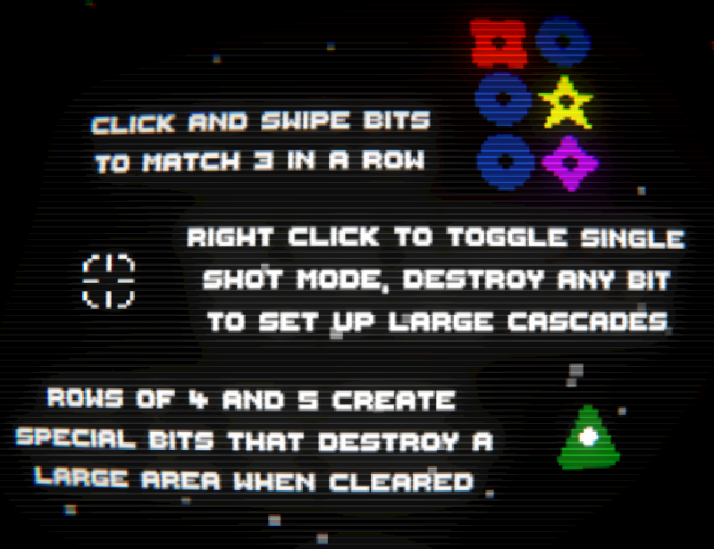 Matchin' Bits is a very simple match 3 puzzle with room for strategy with the mode changing mechanic. My highscore is BARELY over 100,000 so uh beat that.
